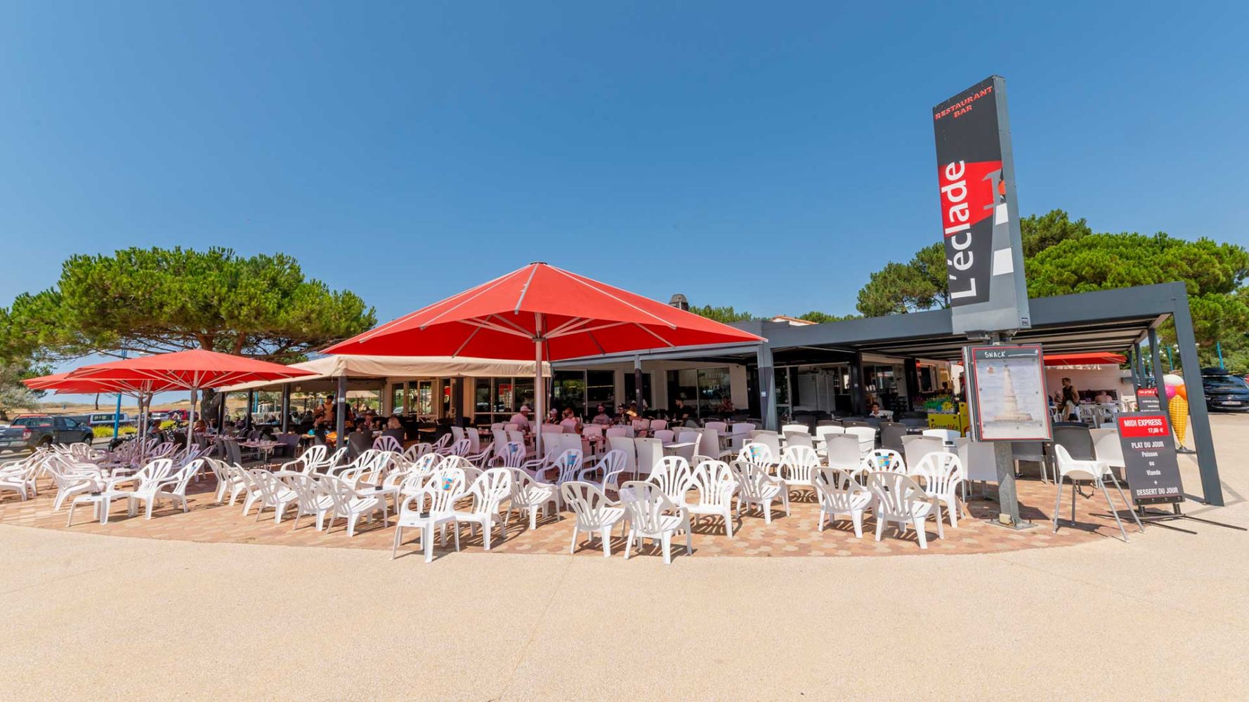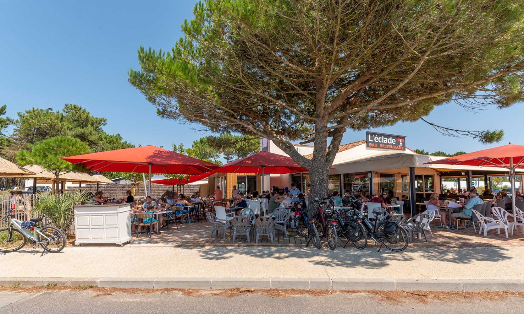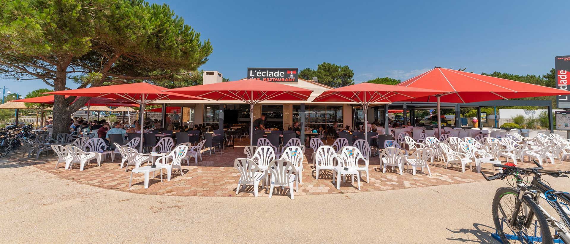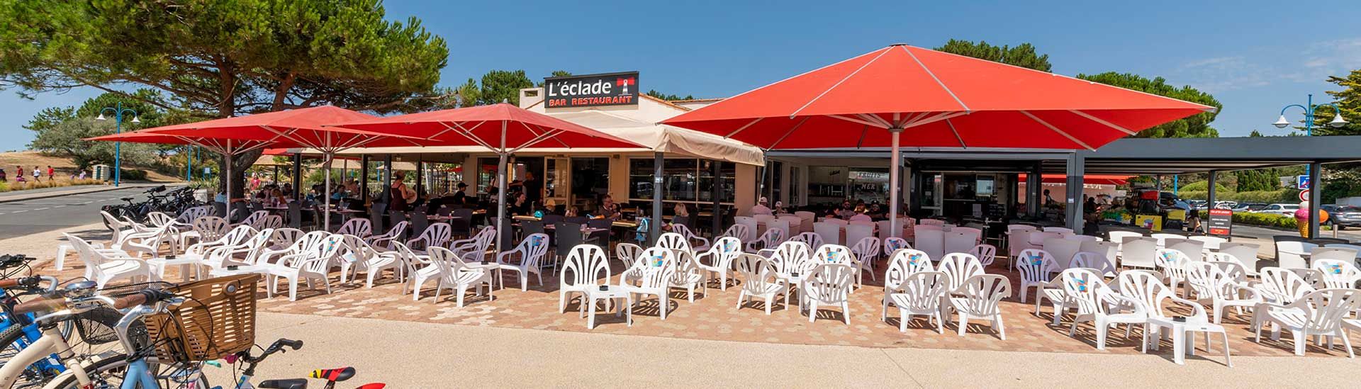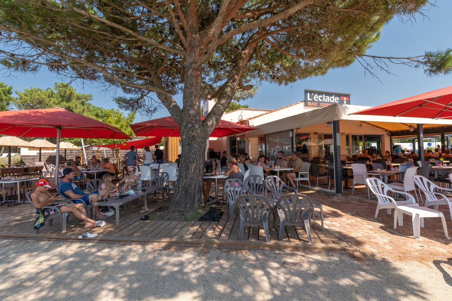 Bar à cocktails, bar à bières, mange debout, parasols paillotte ou tables de restaurant classique, L'Eclade vous accueille en continu pendant tout l'été
