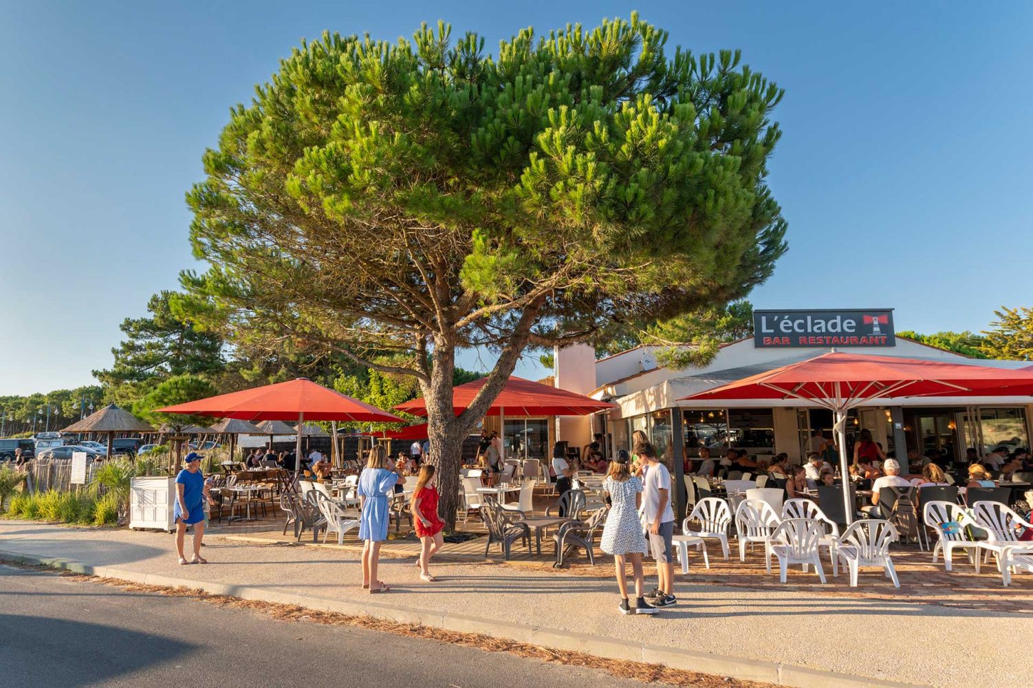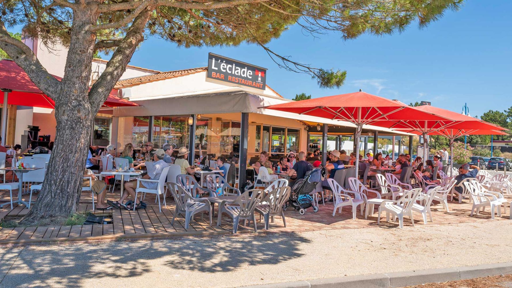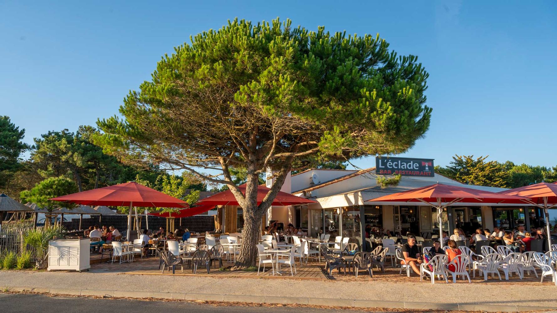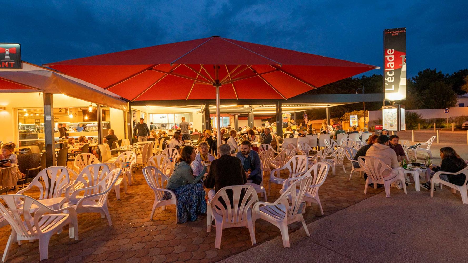 Bar à cocktails, bar à bières, mange debout, parasols paillotte ou tables de restaurant classique, L'Eclade vous accueille en continu pendant tout l'été